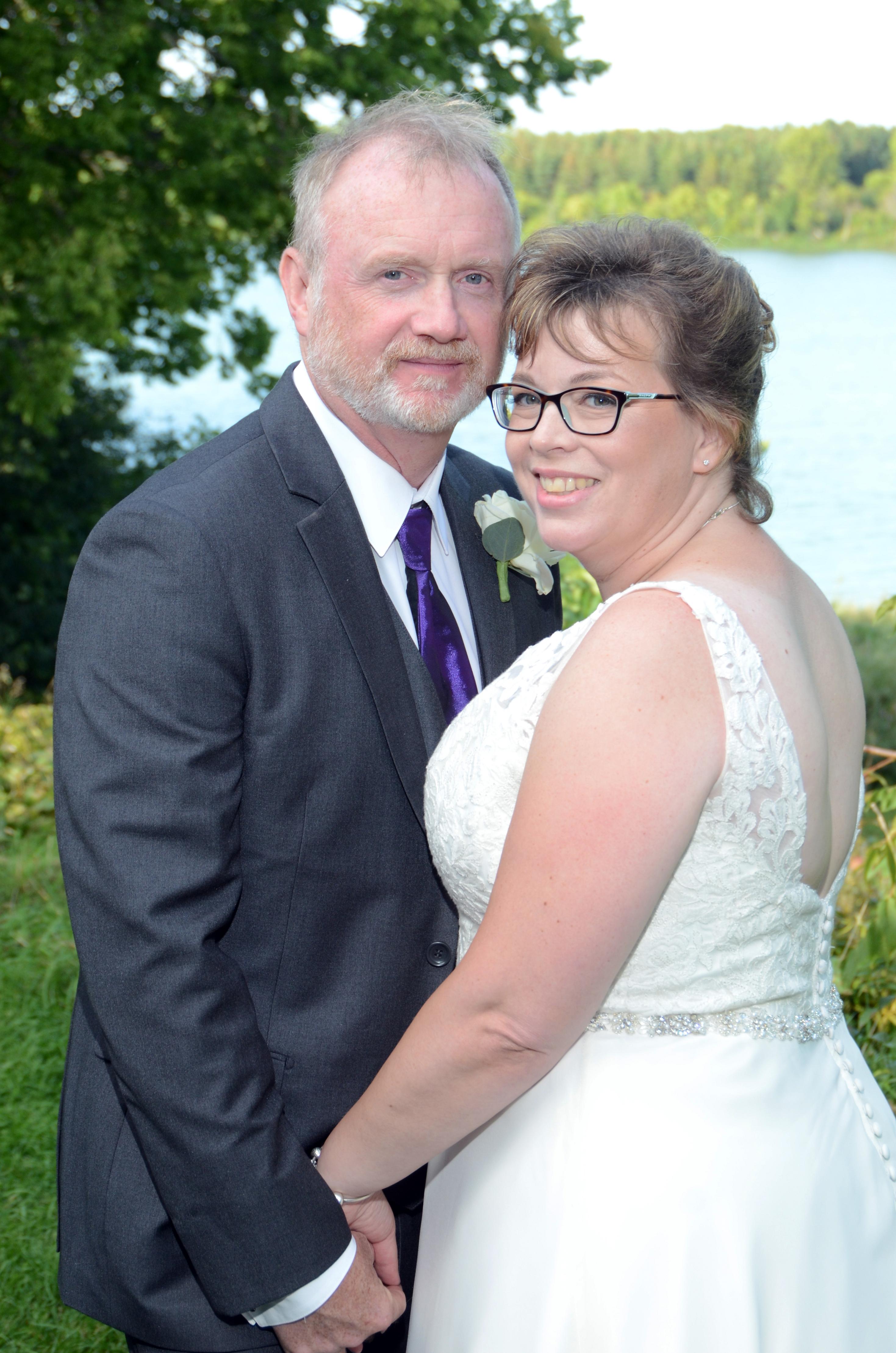 Bride and groom wedding photo with lake in background at Fanshawe Pioneer Village by Columbia Photos